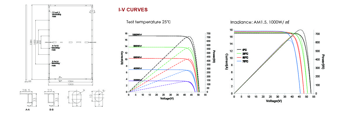 * Trong Điều kiện thử nghiệm tiêu chuẩn (STC) với cường độ bức xạ 1000 W/m 2 , quang phổ AM 1,5 và nhiệt độ tế bào là 25°C.