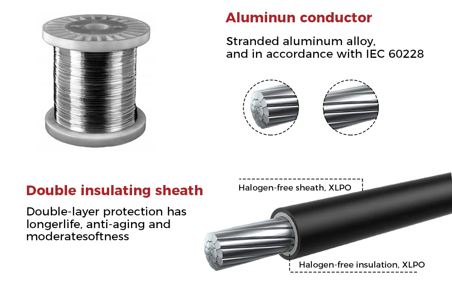 Không có halogen. Cáp điện áp thấp chống tia cực tím. Cáp nhôm TÜV2642 đặc biệt phù hợp cho các ứng dụng ngoài trời nhờ lớp vỏ ngoài rất chắc chắn.