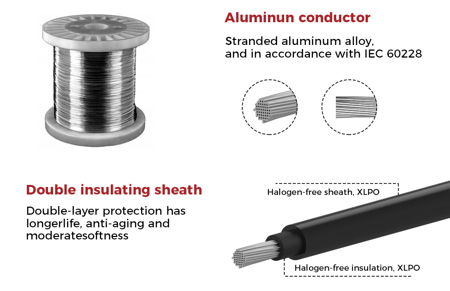 Không có halogen. Cáp điện áp thấp chống tia cực tím. Cáp nhôm TÜV2642 đặc biệt phù hợp cho các ứng dụng ngoài trời nhờ lớp vỏ ngoài rất chắc chắn.