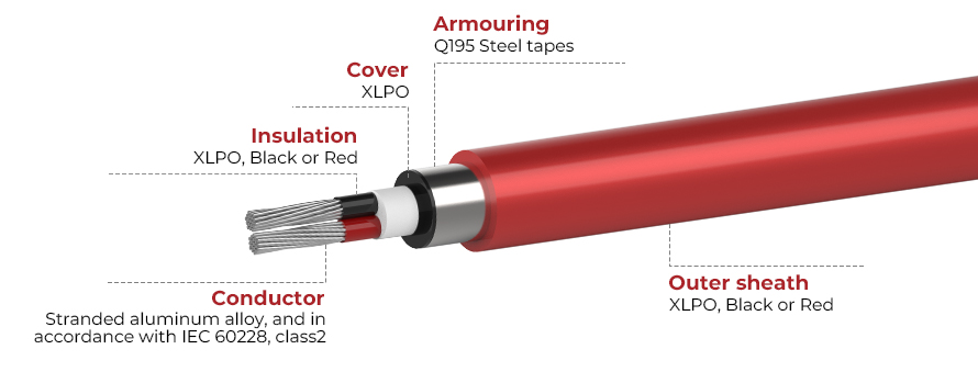 Không có halogen. Cáp điện áp thấp chống tia cực tím. Cáp nhôm TÜV2642 đặc biệt phù hợp cho các ứng dụng ngoài trời và chôn trực tiếp trong lòng đất. Thiết kế đa lõi để giảm chi phí xây dựng.