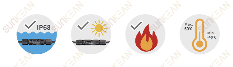 Cầu chì nội tuyến SUNKEAN được thiết kế với vỏ đúc kín IP68. Tiết diện cáp 12~8 AWG / 3.5~10 mm². Các định mức và cấu hình cầu chì khác (1-60A) có sẵn theo yêu cầu (ví dụ: với một đầu nối hoặc không có đầu nối). Nó có thể hoạt động ở nhiệt độ -40~60℃.