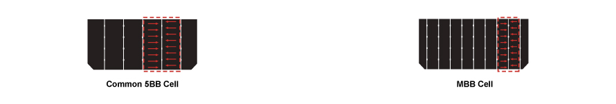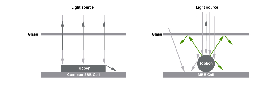 so sánh với các mô-đun 5BB thông thường , Các mô-đun MBB sử dụng dải băng hình tròn có thể giảm diện tích che bóng và liên tục phản chiếu ánh sáng tới để tăng cường khả năng phát điện .