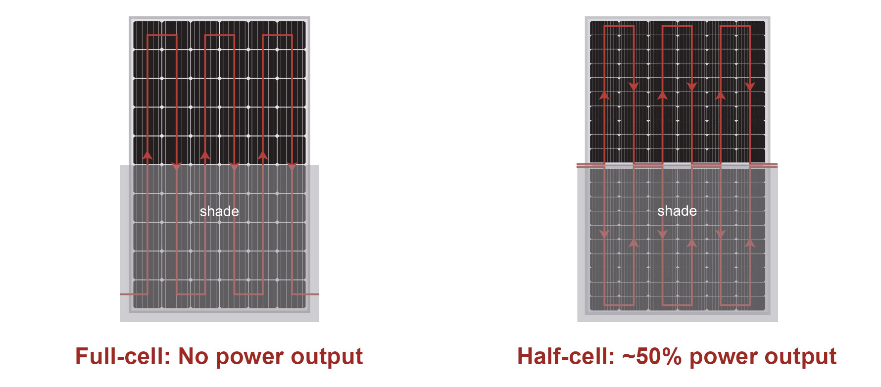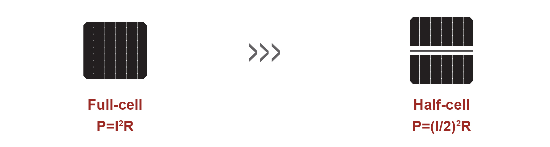 các tấm pin mặt trời nửa tế bào đúng như tên gọi của chúng - các tấm pin mặt trời truyền thống đã được cắt đôi bằng máy cắt laser . trái ngược với các mô-đun tiêu chuẩn , chứa 60 hoặc 72 tế bào , một nửa tế bào mô-đun tăng gấp đôi số lượng tế bào lên 120 hoặc 144 tế bào trên mỗi mô-đun . nó có cùng kích thước với mô-đun tế bào tiêu chuẩn nhưng với các tế bào cắt một nửa ., công nghệ nhân đôi tế bào tạo ra nhiều cơ hội hơn để lấy năng lượng mặt trời từ ánh sáng mặt trời và gửi nó đến biến tần .