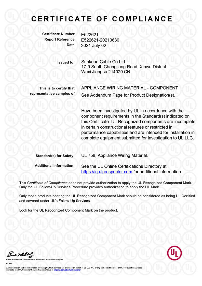 Gần đây, Sunkean thu được UL758 Sản phẩm tiêu chuẩn Chứng nhận. Giấy chứng nhận chứa 6 sản phẩm Thông số kỹ thuật: 1015, 1283, 1284, 10070, 10269, 11627.