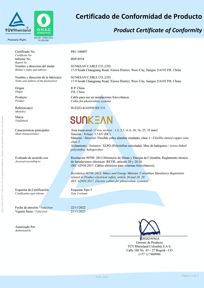 SUNKEAN hôm nay thông báo rằng Công ty đã đạt được chứng nhận RETIE của Colombia cho các loại cáp năng lượng mặt trời H1Z2Z2-K/62930 IEC131. Chứng chỉ này bao gồm cáp năng lượng mặt trời 1.5~35mm 2 H1Z2Z2-K/62930 IEC131.