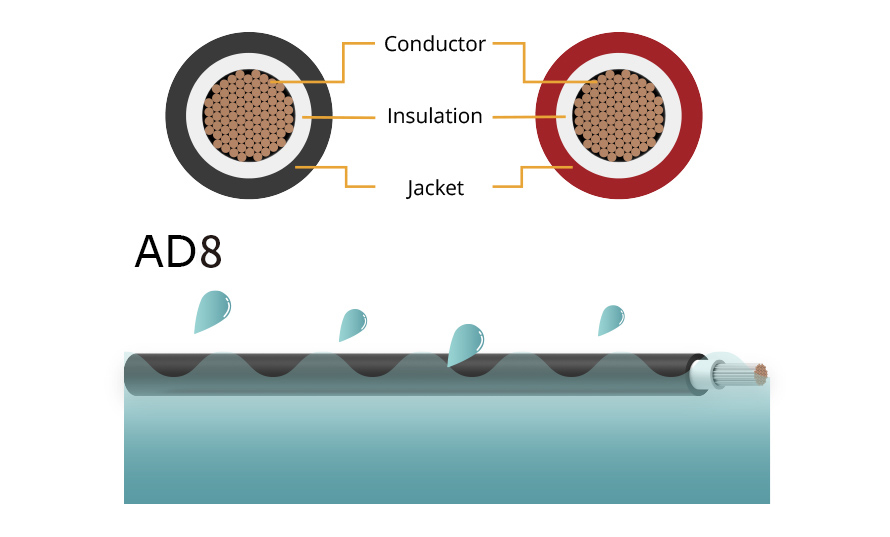 Cáp có lớp bảo vệ AD8 có thể chịu được ngâm trong nước trong thời gian không xác định. Nếu cáp trong hệ thống lắp đặt năng lượng mặt trời không ngâm trong nước thời gian dài thì nên chọn cáp AD7.