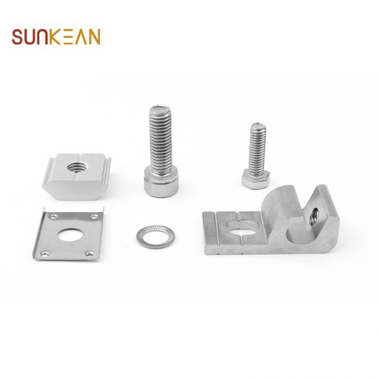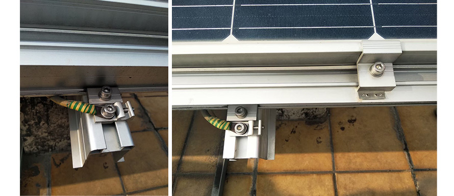 phần này được lắp ráp bằng các gai tiếp địa chống sét và vít inox.Khi vít được siết chặt, các gai trên cọc tiếp đất chống sét sẽ xuyên qua lớp anốt của thanh ray hợp kim nhôm hoặc bề mặt của bất kỳ kết cấu kim loại dẫn điện nào khác, do đó các kết cấu kim loại tiếp xúc với nhau tạo thành một kết nối tĩnh điện kín khí, còn quang điện thì tĩnh điện trên môđun và giá đỡ quang điện được dẫn tới dây đồng nối đất và dẫn xuống đất.