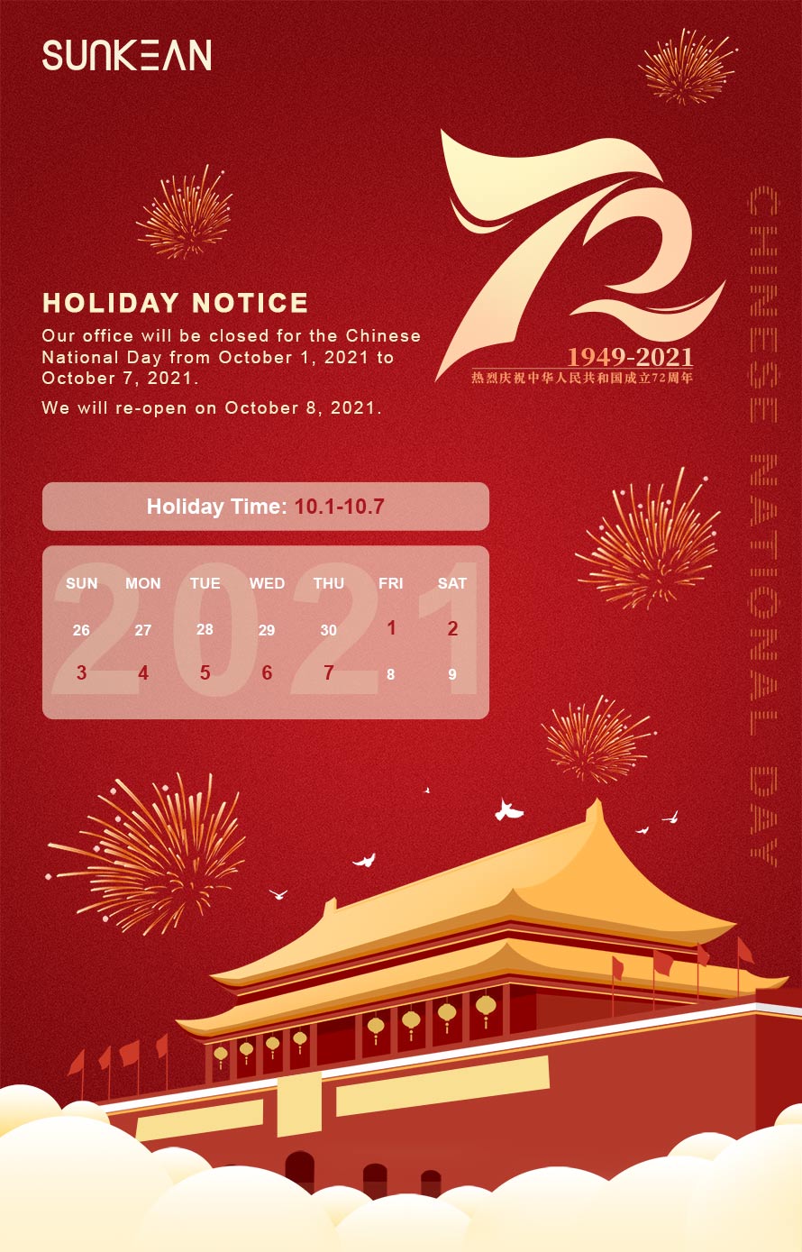 Ở Trung Quốc, mọi người sẽ kỷ niệm ngày lễ Quốc khánh. Và tất nhiên, chúng tôi có bảy ngày nghỉ lễ từ ngày 1 tháng 10 đến ngày 7 tháng 10. Trong thời gian này, văn phòng của chúng tôi sẽ đóng cửa.