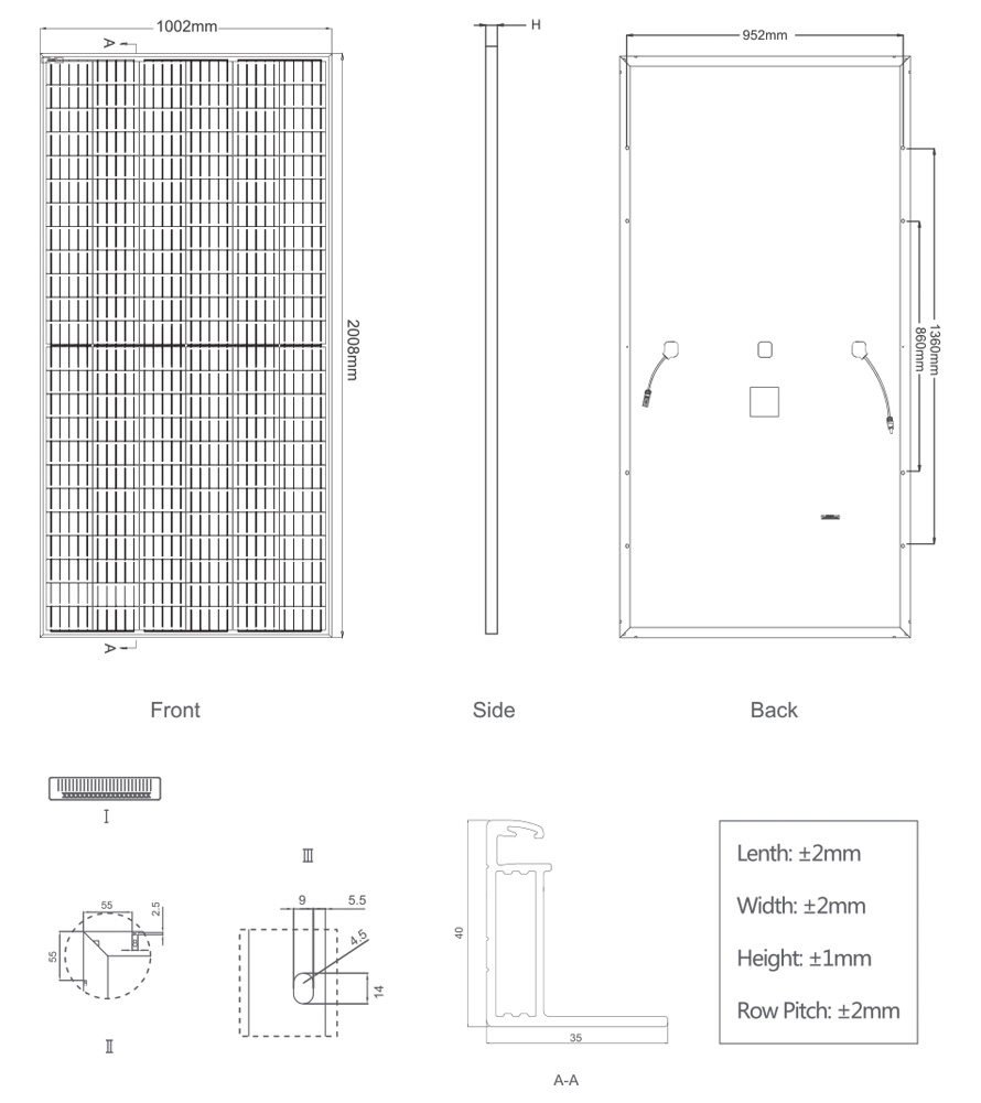 | Kính trước | 3.2mm, Chống phản xạ Lớp phủ, truyền cao, sắt thấp, kính cường lực |