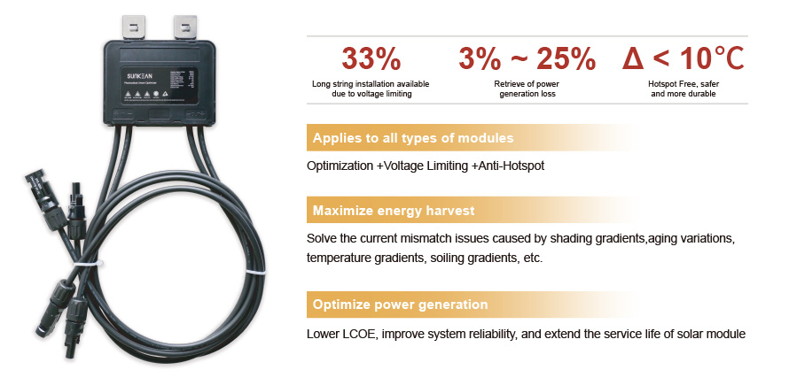 Bộ tối ưu hóa bên ngoài mô-đun PV của sunkean có thể được gắn vào mặt sau của mỗi bảng điều khiển năng lượng mặt trời trong mảng . để tối ưu hóa hiệu suất của mỗi bảng điều khiển trong hệ thống năng lượng mặt trời , bất kể hướng của mặt trời , bóng râm , hoặc thậm chí làm hỏng một hoặc nhiều tấm .