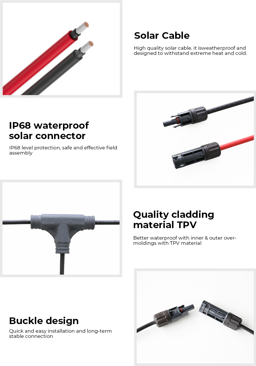 Bộ dây nhánh SUNKEAN T có xếp hạng chống nước IP68 và có thể được sử dụng trong phạm vi nhiệt độ hoạt động rộng từ -40 °C đến +90 °C. Điện trở tiếp xúc thấp hơn và khả năng truyền dòng điện cao hơn đảm bảo hiệu suất sản phẩm cao.