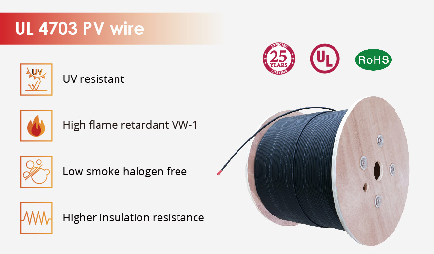 UL 4703 có dây dẫn bằng đồng trần và lớp cách điện XLPO hai lớp, nó dành cho các ứng dụng lên đến 2000 vôn và nhiệt độ từ -40°C đến +90°C ướt hoặc khô.