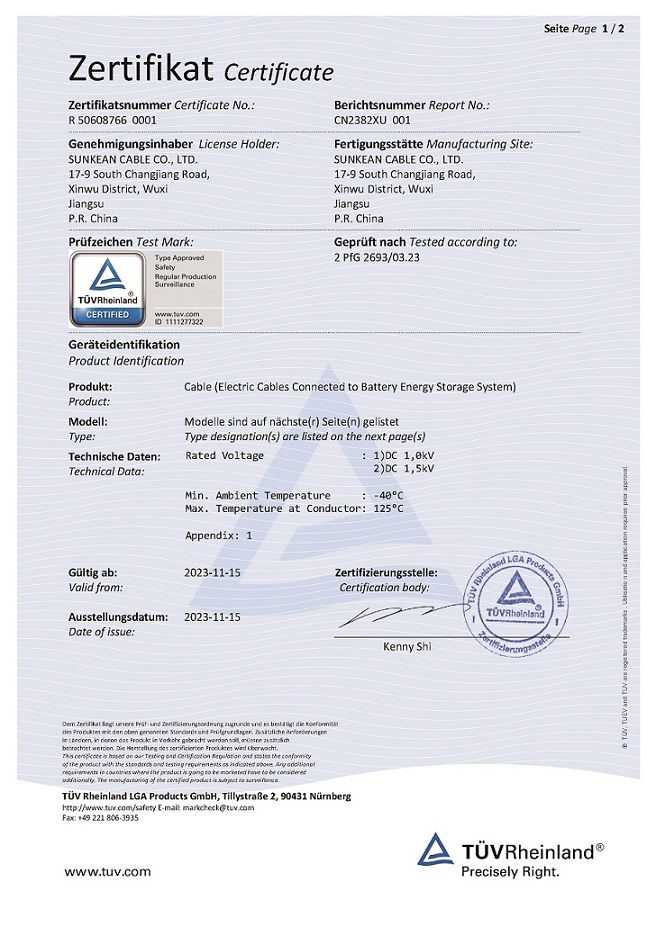 Chúng tôi vui mừng thông báo rằng dây lưu trữ năng lượng của SUNKEAN đã đạt chứng nhận TÜV hoàn toàn mới : 2 PfG 2693/03.23 , được tối ưu hóa hơn phiên bản được công bố vào năm 2019.